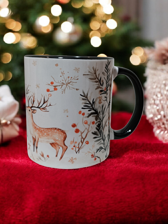 Apportez une touche de poésie hivernale à votre quotidien avec cette magnifique tasse en céramique décorée de cerfs élégants, entourés de branches de sapin, baies rouges et flocons délicats.
